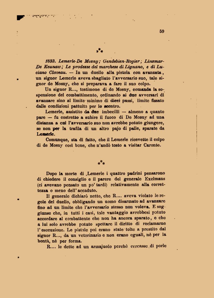 Lemerle, assistito da due imbecilli — almeno a quanto pare — fu costretto a subire il fuoco di De Mosny ad una distanza a cai l'avversario suo non avrebbe potuto giungere, se non per la trafila di un altro pajo di palle, sparate da Lemerle.