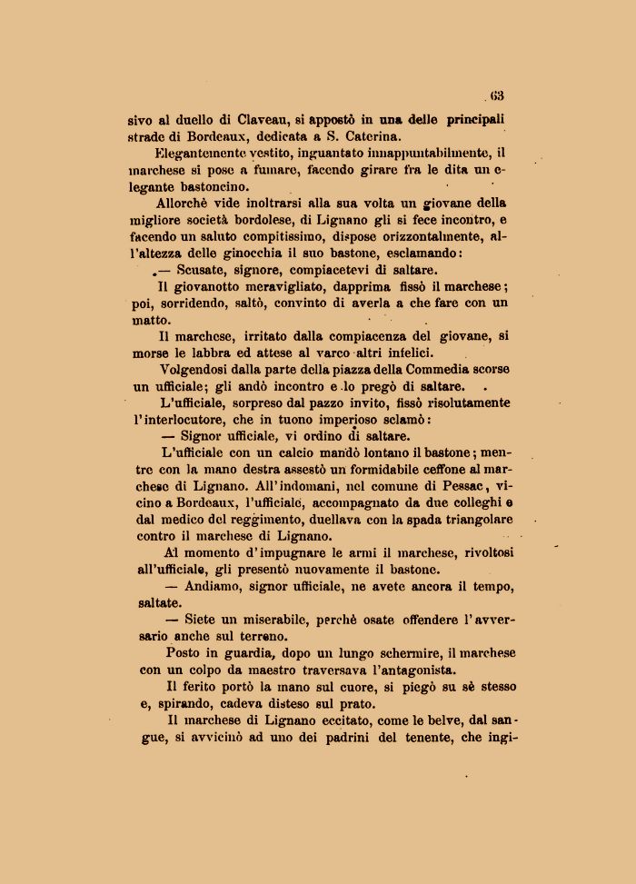 L'ufficiale con un calcio mandò lontano il bastone ; mentre con la mano destra assestò un formidabile ceffone al marchese di Lignano. All'indomani, nel comune di Pessac, vicino a Bordeaux, l'ufficiale, accompagnato da due colleghi e dal medico del reggimento, duellava con la spada triangolare contro il marchese di Lignano.