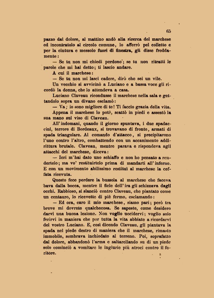 — Ed ora, caro il mio marchese, siamo pari; però tra breve mi dovrete qualchecosa. Se sapeste, come desidero darvi una buona lezione. Non voglio uccidervi ; voglio solo ferirvi in maniera che per tutta la vita abbiate a ricordarvi del vostro Luciano. E, così dicendo Claveau, gli piantava la spada nel piede destro di maniera che il marchese, rimasto immobile, sembrava inchiodato al terreno. Poi, soprafatto dal dolore, abbandonò l'arma e saltarellando su di un piede solo cominciò a vomitare le ingiurie più atroci contro il feritóre. «