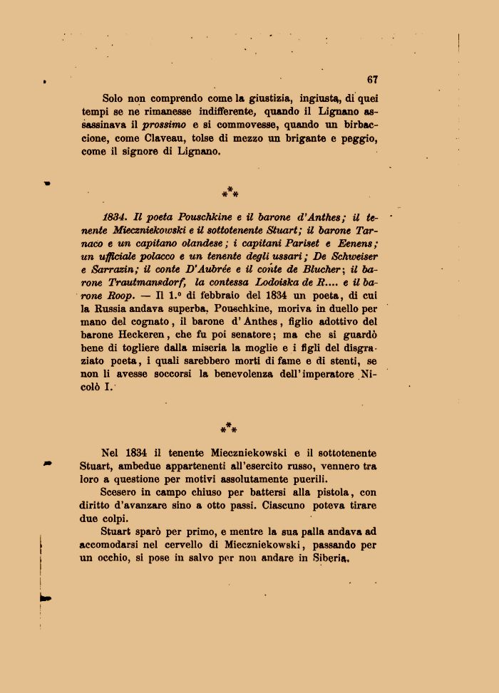 1834. Il poeta Pouschkine e il barone d'Anth.es; il tenente Mieczniekowski e il sottotenente Stuart; il barone Tar-naco e un capitano olandese ; i capitani Pariset e Eenens ; un ufficiale polacco e un tenente degli ussari ; De Schweiser e Sarrazin; il conte D'Aubrée e il conte de Blucher\ il barone Trautmansdorf, la contessa Lodoiska de R.... e il barone Roop. — Il 1.° di febbraio del 1834 un poeta, di cui la Russia andava superba, Pouschkine, moriva in duello per mano del cognato , il barone d' Anthes , figlio adottivo del barone Heckeren, che fu poi senatore ; ma che si guardò bene di togliere dalla miseria la moglie e i figli del disgraziato poeta, i quali sarebbero morti di fame e di stenti, se non li avesse soccorsi la benevolenza dell'imperatore Nicolò I.