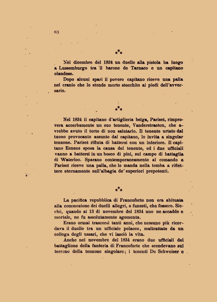 La pacifica repubblica di Francoforte non era abituata alla commozione dei duelli allegri, o funesti, che fossero. Sicché, quando ai 13 di novembre del 1834 uno ne accadde e mortale, ne fu assolutamente sgomenta.