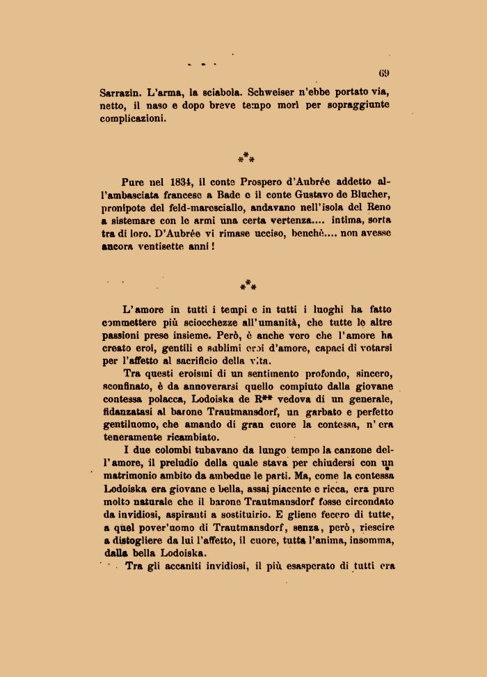 Tra questi eroismi di un sentimento profondo, sincero, sconfinato, è da annoverarsi quello compiuto dalla giovane contessa polacca, Lodoiska de R** vedova di un generale, fidanzatasi al barone Trautmansdorf, un garbato e perfetto gentiluomo, che amando di gran cuore la contessa, n' era teneramente ricambiato.