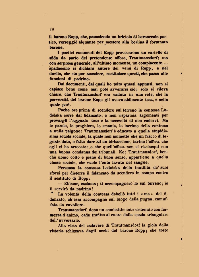 Poche ore prima di scendere sul terreno la contessa Lo-doiska corre dal fidanzato; e non risparmia argomenti per provargli l'agguato teso e la necessità di non cadervi. Ma le parole, le preghiere, le smanie, le lacrime della contessa a nulla valgono : Trautmansdorf è educato a quella stupidissima scuola sociale, la quale non ammette che un fracco di legnate date, o fatte dare ad un birbaccione, lavino l'offesa che egli ci ha arrecatole che quell'offesa non si risciacqui con una buona condanna dei tribunali. No; Trautmansdorf, benché uomo colto e pieno di buon senso, appartiene a quella classe sociale, che vuole l'onta lavata nel sangue.