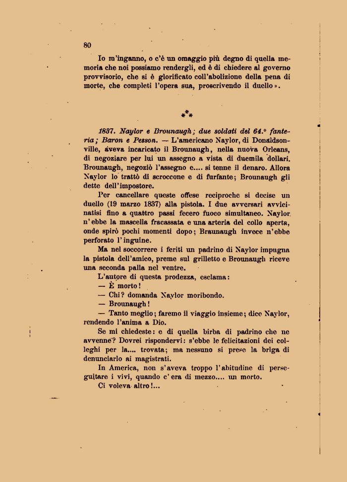 1837. Naylor e Brounaugh; due soldati del 64. fanteria ; Baron e Pesson. — L'americano Naylor, di Donaldson-ville, aveva incaricato il Brounaugh, nella nuova Orleans, di negoziare per lui un assegno a vista di duemila dollari. Brounaugh, negoziò l'assegno e.... si tenne il denaro. Allora Naylor lo trattò di scroccone e di furfante; Brounaugh gli dette dell'impostore.