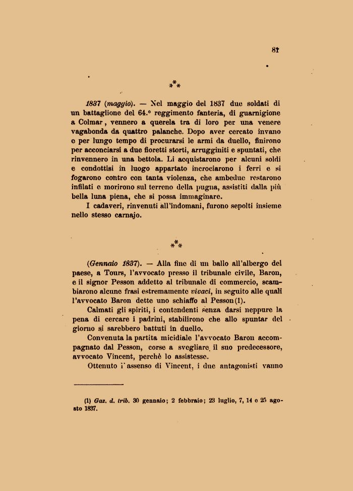 1837 (maggio). — Nel maggio del 1837 due soldati di un battaglione del 64.° reggimento fanteria, di guarnigione a Colmar, vennero a querela tra di loro per una venere vagabonda da quattro palanche. Dopo aver cercato invano e per lungo tempo di procurarsi le armi da duello, finirono per acconciarsi a due fioretti storti, arrugginiti e spuntati, che rinvennero in una bettola. Li acquistarono per alcuni soldi e condottisi in luogo appartato incrociarono i ferri e si fogarono contro con tanta violenza, che ambedue restarono infilati e morirono sul terreno della pugna, assistiti dalla più bella luna piena, che si possa immaginare.