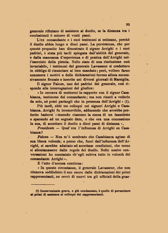 Falcon — Non m'è sembrato che Casabianca agisse di sua libera volontà; e penso che, fuori dall'influenza dell'Arrighi, si sarebbe adattato ad accettai» condizioni, che meno si allontanassero dalle regole del duello. Nelle nostre conversazioni ho constatato ch'egli subiva tutte le volontà del comandante Arrighi ».