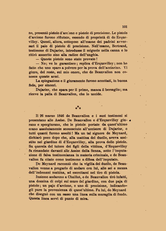 Insieme andarono a Chaillot, e de Beauvallon tirò infatti, una dozzina di colpi sul muro del giardino, con due paja di pistole ; un pajo d'arcione, e uno di precisione, indicandogli pure la provenienza di quest'ultime. Fu lui, de Meynard che disegnò con un sasso una linea sulla muraglia di fondo. Questa linea servi di punto di mira.