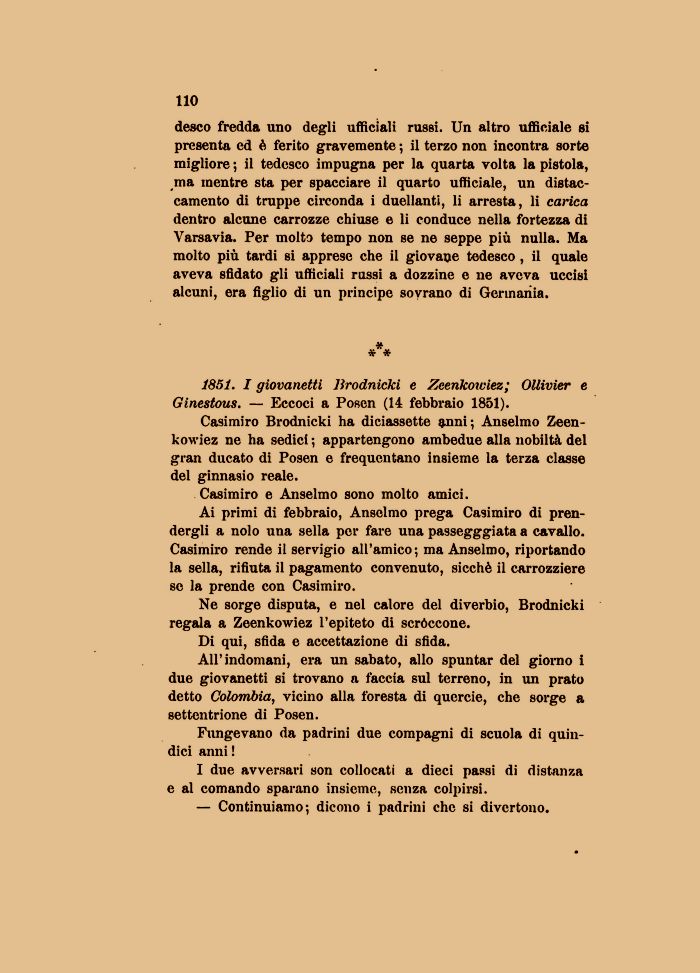 desco fredda uno degli ufficiali russi. Un altro ufficiale si presenta ed è ferito gravemente ; il terzo non incontra sorte migliore ; il tedesco impugna per la quarta volta la pistola, ma mentre sta per spacciare il quarto ufficiale, un distaccamento di truppe circonda i duellanti, li arresta, li carica dentro alcune carrozze chiuse e li conduce nella fortezza di Varsavia. Per molto tempo non se ne seppe più nulla. Ma molto più tardi si apprese che il giovane tedesco , il quale aveva sfidato gli ufficiali russi a dozzine e ne aveva uccisi alcuni, era figlio di un principe sovrano di Germania.