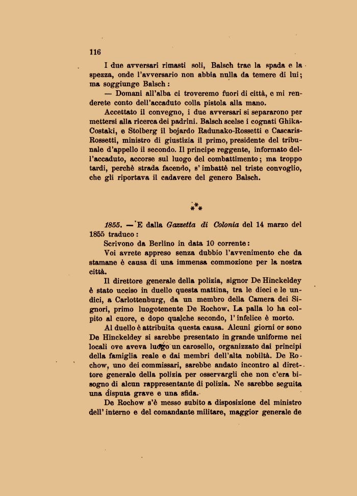 Il direttore generale della polizia, signor De Hinckeldey è stato ucciso in duello questa mattina, tra le dieci e le undici, a Carlottenburg, da un membro della Camera dei Signori, primo luogotenente De Rochow, La palla lo ha colpito al cuore, e dopo qualche secondo, l'infelice è morto.