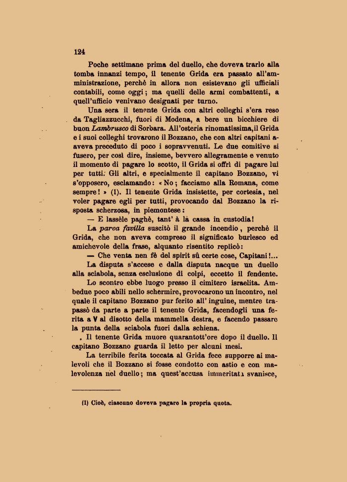 Una sera il tenente Grida con altri colleghi s'era reso da Tagliazzucchi, fuori di Modena, a bere un bicchiere di buon Lambnisco di Sor'oara. All'osteria rinomatissima,il Grida e i suoi colleghi trovarono il Bozzano, che con altri capitani a-aveva preceduto di poco i sopravvenuti. Le due comitive si fusero, per cosi dire, insieme, bevvero allegramente e venuto il momento di pagare lo scotto, il Grida si offri di pagare lui per tutti: Gli altri, e specialmente il capitano Bozzano, vi s'opposero, esclamando: «No-, facciamo alla Romana, come sempre ! » (1). Il tenente Grida insistette, per cortesia, nel voler pagare egli per tutti, provocando dal Bozzano la risposta scherzosa, in piemontese :