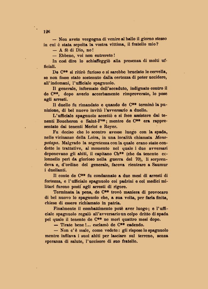 Fu deciso che lo scontro avesse luogo con la spada, nelle vicinanze della Loira, in una località chiamata Mono-potapa. Malgrado la segretezza con la quale erano state condotte le trattative, al momento nel quale i due avversari deponevano gli abiti, il capitano Ch** (che da tenente colonnello peri da glorioso nella guerra del 70), li sorprendeva e, d'ordine del generale, faceva rientrare a Saumur i duellanti.