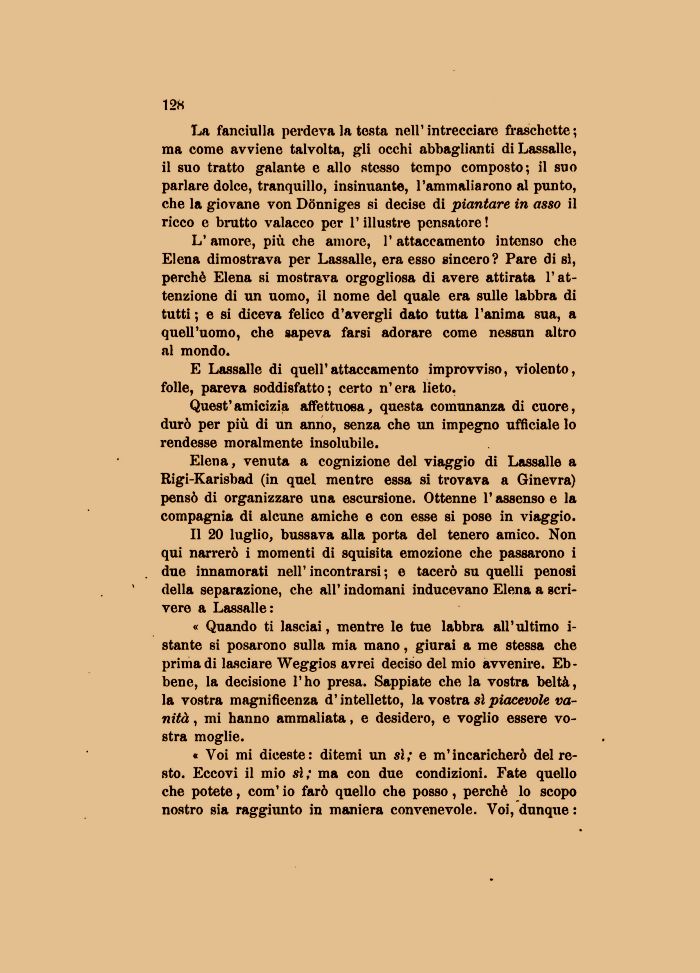 Il 20 luglio, bussava alla porta del tenero amico. Non qui narrerò i momenti di squisita emozione che passarono i due innamorati nell'incontrarsi ; e tacerò su quelli penosi della separazione, che all' indomani inducevano Elena a scrivere a Lassalle: