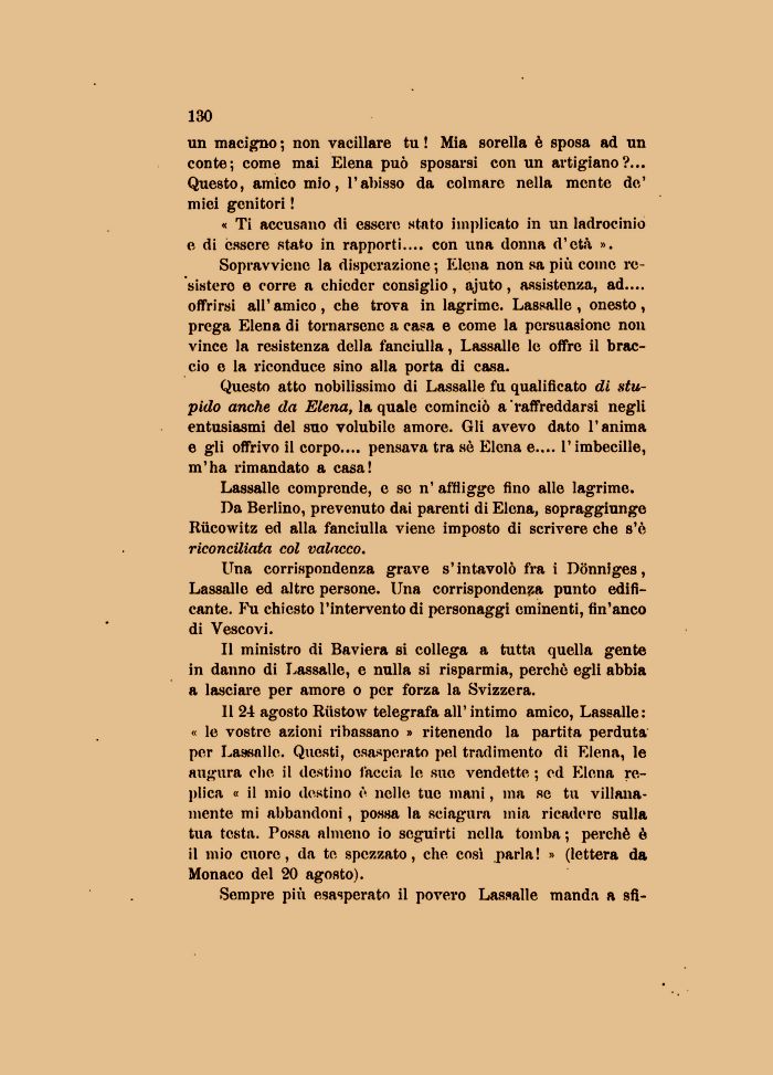 Il 24 agosto Riistow telegrafa all'intimo amico, Lassalle: « le vostre azioni ribassano » ritenendo la partita perduta per Lassalle. Questi, esasperato pel tradimento di Elena, le augura clic il destino faccia le sue vendette ; ed Elena replica « il mio destino è nelle tue mani, ma se tu villanamente mi abbandoni , possa la sciagura mia ricadere sulla tua testa. Possa almeno io seguirti nella tomba ; perchè è il mio cuore, da te spezzato, che così parla! » (lettera da Monaco del 20 agosto).
