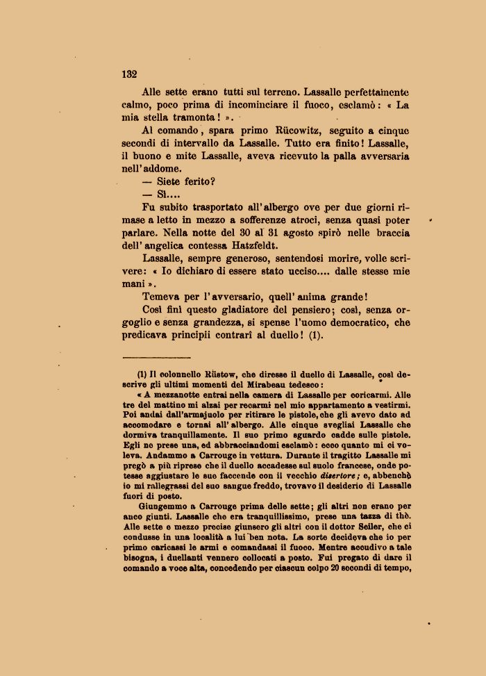 « A mezzanotte entrai nella camera di Lassalle per coricarmi. Alle tre del mattino mi alzai per recarmi nel mio appartamento a vestirmi. Poi andai dall'armaiuolo per ritirare le pistole, ohe gli avevo dato ad accomodare e tornai all' albergo. Alle cinque svegliai Lassalle che dormiva tranquillamente. Il suo primo sguardo oadde sulle pistole. Egli no prese una, ed abbracciandomi esclamò : ecoo quanto mi oi voleva. Andammo a Carrougein vettura. Durante il tragitto Lassalle mi pregò a più riprese che il duello accadesse sul suolo francese, onde potesse aggiustare le suo faccende con il vecchio disertore ; e, abbeuchè io mi rallegrassi del suo sangue freddo, trovavo il desiderio di Lassalle fuori di posto.