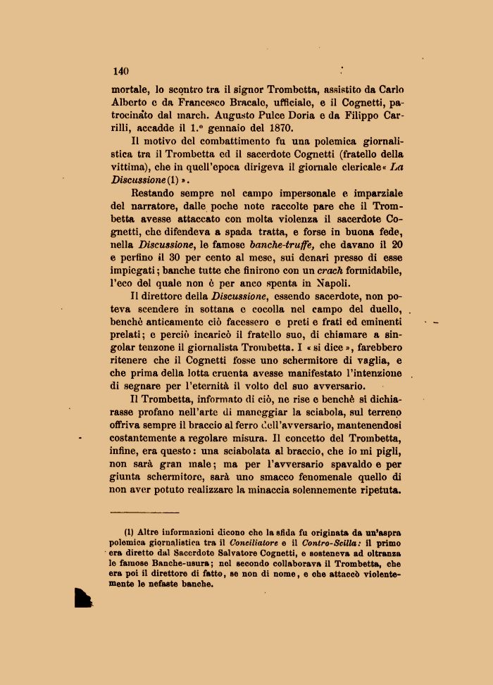 (1) Altre informazioni dicono cho la efida fu originata da un'aspra polemica giornalistica tra il Conciliatore e il Contro-Scilla : il primo era diretto dal Sacerdote Salvatore Cognetti, e sosteneva ad oltranza lo famose Banche-usura; nel secondo collaborava il Trombetta, che era poi il direttore di fatto, se non di nome, e ohe attaccò violentemente le nefaste banche.