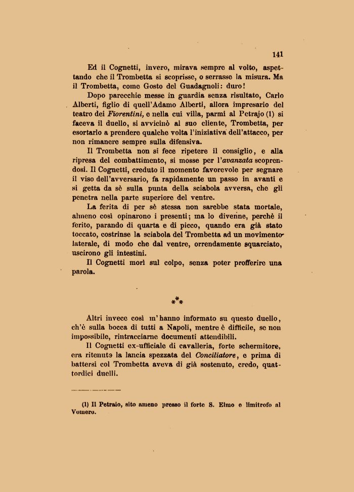 Il Cognetti ex-ufficiale di cavalleria, forte schermitore, era ritenuta la lancia spezzata del Conciliatore, e prima di battersi col Trombetta aveva di già sostenuto, credo, quattordici duelli.
