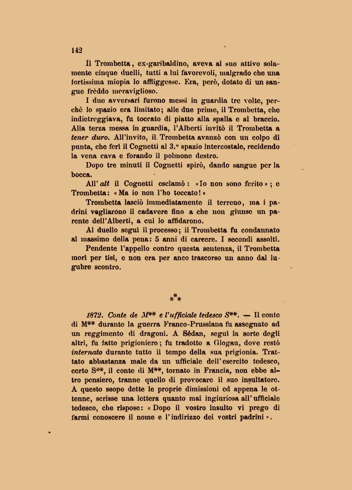 Il Trombetta, ex-garibaldino, aveva al (suo attivo solamente cinque duelli, tutti a lui favorevoli, malgrado che una fortissima miopia lo affliggesse. Era, però, dotato di un sangue fréddo meraviglioso.