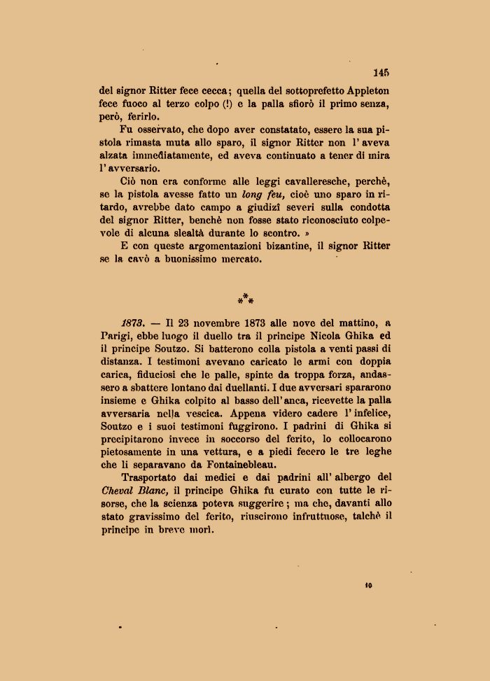 1873. — Il 23 novembre 1873 alle nove del mattino, a Parigi, ebbe luogo il duello tra il principe Nicola Ghika ed il principe Soutzo. Si batterono colla pistola a venti passi di distanza. I testimoni avevano caricato le armi con doppia carica, fiduciosi che le palle, spinte da troppa forza, andassero a sbattere lontano dai duellanti. I due avversari spararono insieme e Ghika colpito al basso dell' anca, ricevette la palla avversaria nella vescica. Appena videro cadere l'infelice, Soutzo e i suoi testimoni fuggirono. I padrini di Ghika si precipitarono invece in soccorso del ferito, lo collocarono pietosamente in una vettura, e a piedi fecero le tre leghe che li separavano da Fontainebleau.