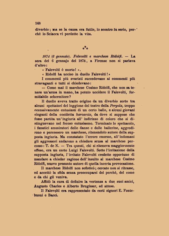 1874 (6 gennaio). Falevolti e marchese Bidolfi. — La sera del 6 gennajo del 1874, a Firenze non si parlava d'altro :