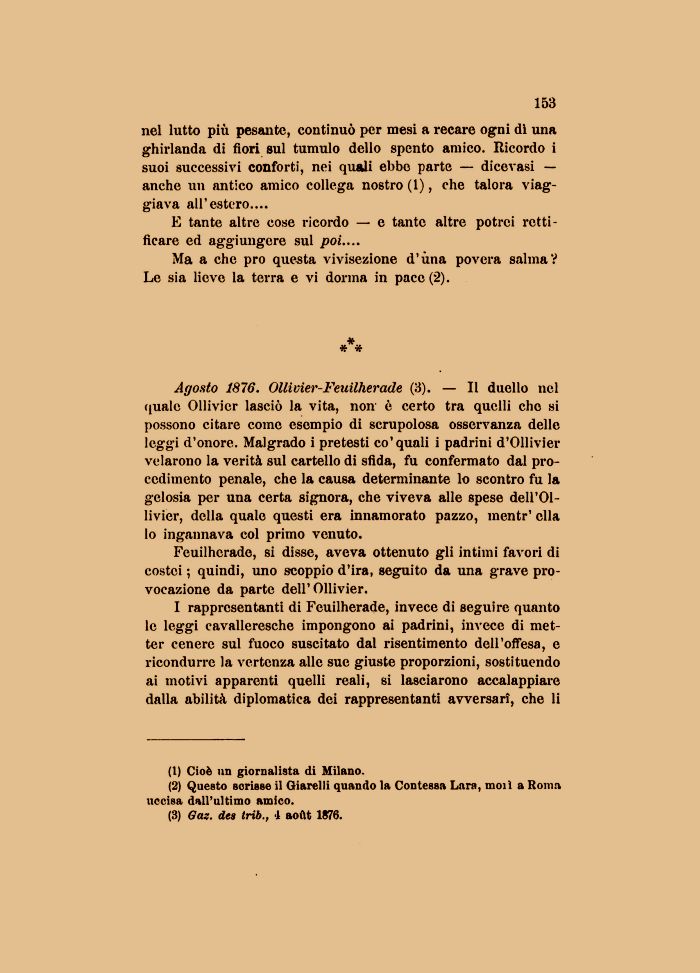 Agosto 1876. OUivier-Feuilherade (3). — Il duello nel quale Ollivier lasciò la vita, non è certo tra quelli che si possono citare come esempio di scrupolosa osservanza delle leggi d'onore. Malgrado i pretesti co'quali i padrini d'Ollivier velarono la verità sul cartello di sfida, fu confermato dal procedimento penale, che la causa determinante lo scontro fu la gelosia per una certa signora, che viveva alle spese dell'Ol-livier, della quale questi era innamorato pazzo, mentr' ella lo ingannava col primo venuto.