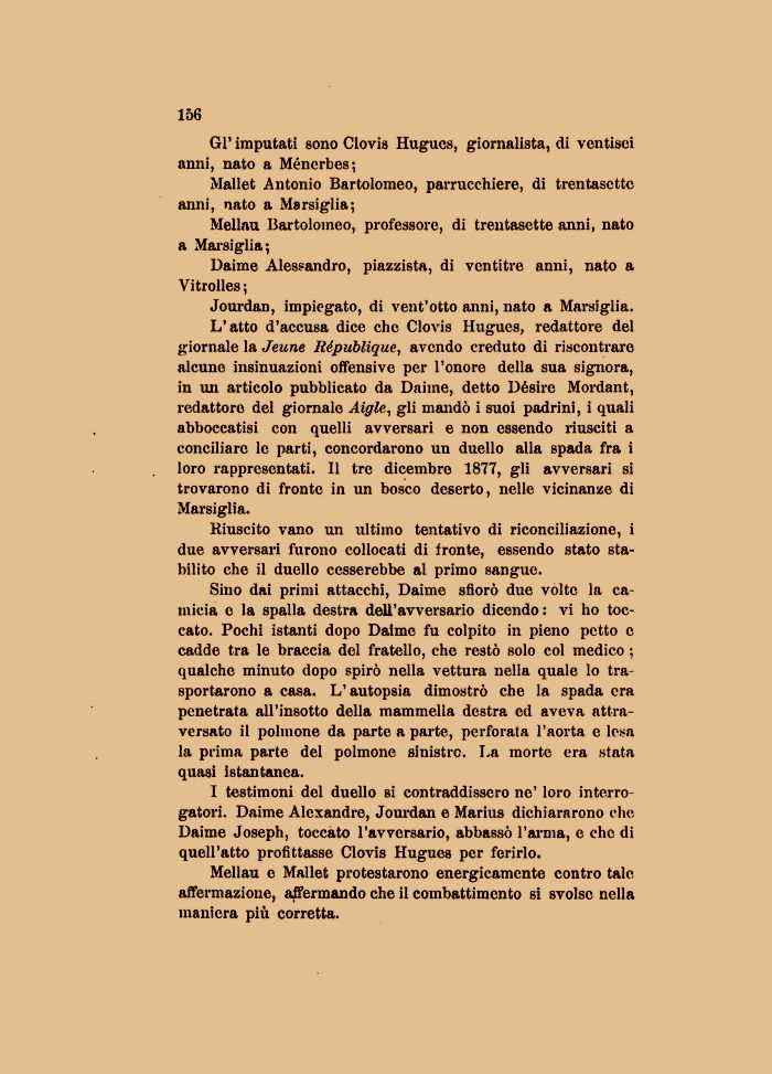 L'atto d'accusa dice che Clovis Hugues, redattore del giornale la Jeune Iiépublique, avendo creduto di riscontrare alcune insinuazioni offensive per l'onore della sua signora, in un articolo pubblicato da Daime, detto Désire Mordant, redattore del giornale Aigle, gli mandò i suoi padrini, i quali abboccatisi con quelli avversari e non essendo riusciti a conciliare le parti, concordarono un duello alla spada fra i loro rappresentati. 11 tre dicembre 1877, gli avversari si trovarono di fronte in un bosco deserto, nelle vicinanze di Marsiglia.