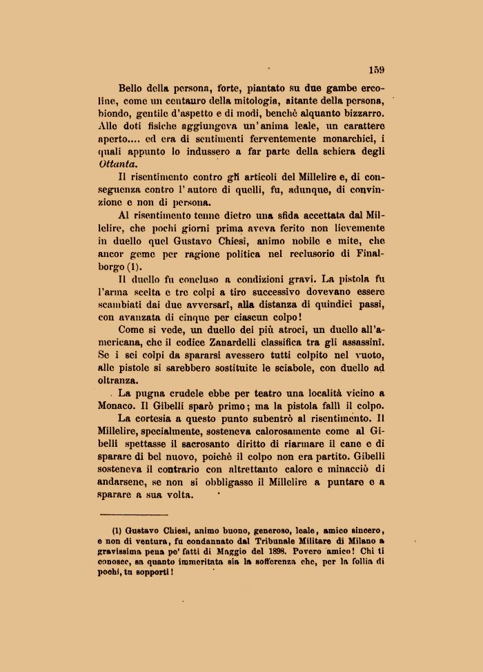 Al risentimento tenne dietro una sfida accettata dal Millelire, che pochi giorni prima aveva ferito non lievemente in duello quel Gustavo Chiesi, animo nobile e mite, che ancor geme per ragione politica nel reclusorio di Final-borgo (1).