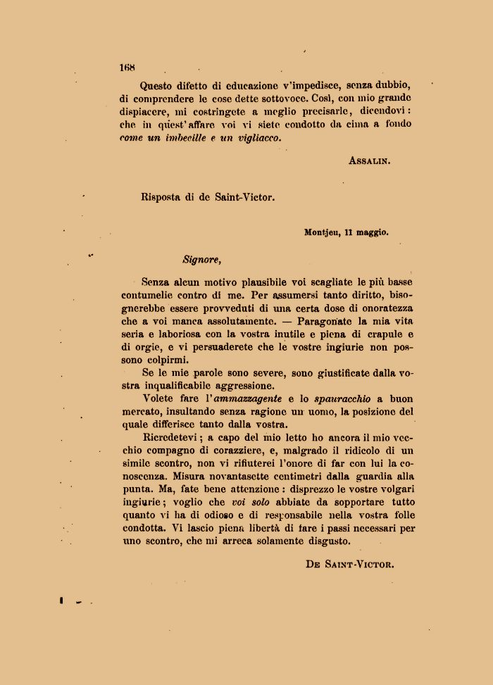 Ricredetevi ; a capo del mio letto ho ancora il mio vecchio compagno di corazziere, e, malgrado il ridicolo di un simile scontro, non vi rifiuterei l'onore di far con lui la conoscenza. Misura novantasette centimetri dalla guardia alla punta. Ma, fate bene attenzione : disprezzo le vostre volgari ingiurie ; voglio che voi solo abbiate da sopportare tutto quanto vi ha di odioso e di responsabile nella vostra folle condotta. Vi lascio piena libertà di fare i passi necessari per uno scontro, che mi arreca solamente disgusto.