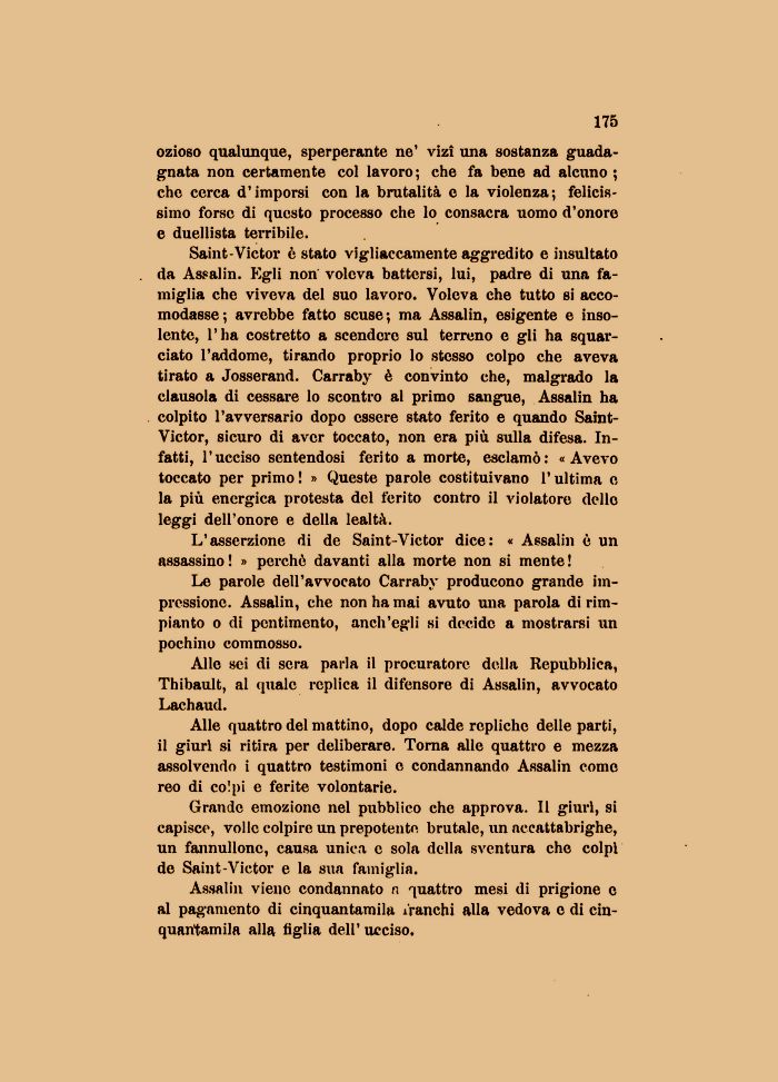 Saint-Victor è stato vigliaccamente aggredito e insultato da Assalin. Egli non voleva battersi, lui, padre di una famiglia che viveva del suo lavoro. Voleva che tutto si accomodasse ; avrebbe fatto scuse ; ma Assalin, esigente e insolente, l'ha costretto a scendere sul terreno e gli ha squarciato l'addome, tirando proprio lo stesso colpo che aveva tirato a Josserand. Carraby è convinto che, malgrado la clausola di cessare lo scontro al primo sangue, Assalin ha colpito l'avversario dopo essere stato ferito e quando Saint-Victor, sicuro di aver toccato, non era più sulla difesa. Infatti, l'ucciso sentendosi ferito a morte, esclamò: «Avevo toccato per primo ! » Queste parole costituivano l'ultima e la più energica protesta del ferito contro il violatore dello leggi dell'onore e della lealtà.