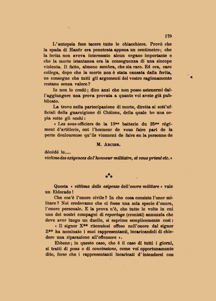 Che cos'è l'onore civile? In che cosa consiste l'onor militare ? Noi credevamo che ci fosse una sola specie d'onore, l'onore personale. E la prova n'è, che tutte le volte in cui uno dei nostri compagni di reportage (cronisti) annunzia che deve aver luogo un duello, si esprime semplicemente cosi :