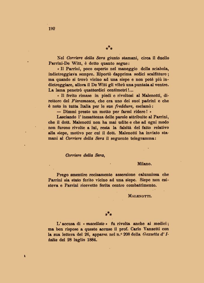 « Il ferito rimase in piedi e rivoltosi al Malenotti, direttore del Fieramosca, che era uno dei suoi padrini e che è noto in tutta Italia per le sue freddure, esclamò : — Dimmi presto un motto per farmi ridere ! » Lasciando l'inesattezza delle parole attribuite al Parrini, che il dott. Malenotti non ha mai udite e che ad ogni modo non furono rivolte a lui, resta la falsità del fatto relativo alla siepe, motivo per cui il dott. Malenotti ha inviato stamani al Corriere della Sera il seguente telegramma: