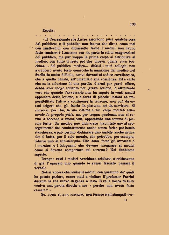« Il Correzionale e le Assise assorbono pure qualche cosa dal pubblico; e il pubblico non faceva Che dire: come mai con quattordici, con diciassette ferite, i medici non hanno fatto smettere? Lasciamo ora da parte le solite esagerazioni del pubblico, ma pur troppo la prima colpa si attribuiva al medico, con tutto il resto poi che diceva quella cara bocchino.... del pubblico medico.... difatti i miei colleghi non avrebbero avuto torto comecché la mansione del medico nel duello sia molto difficile, tanto davanti al codice cavalleresco, che a quello penale, all'umanità e alla coscienza. Ed è certo che se la soluzione di una partita d'armi per gravi offese, debba aver luogo soltanto per grave lesione, è altrettanto vero che quando l'avversario non ha saputo in venti assalti apportare detta lesione, e a forza di piccole lesioni ha impossibilitato l'altro a continuare la tenzone, non può da costui esigere che gli faccia da piattone, nè da servitore. Si conservi, per Dio, la sua vittima e tiri colpi mortali esponendo la propria pelle, ma per troppa prudenza non si rovini il boccone a smozziconi, apportando una somma di piccole ferite. Un medico può dichiarare inabilitato uno al proseguimento del combattimento anche senza ferite per la sola stanchezza, e può perfino dichiarare uno inabile anche prima che si batta, per il solo morale, che potrebbe, per esempio, ridurre uno al sub-deliquio. Che sono forse gli avvocati o i muratori o i falegnami che devono insegnare ai medici come si devono comportare sul terreno ? Noi dobbiamo saperlo.