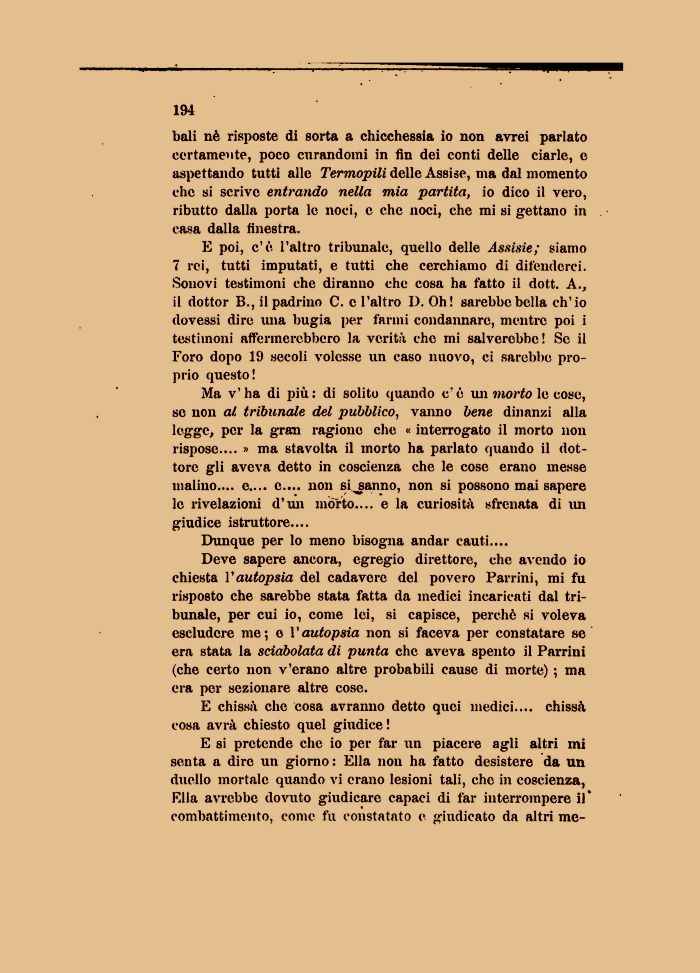 Deve sapere ancora, egregio direttore, che avendo io chiesta l'autopsia del cadavere del povero Parrini, mi fu risposto che sarebbe stata fatta da medici incaricati dal tribunale, per cui io, come lei, si capisce, perchč si voleva escludere me; e l'autopsia non si faceva per constatare se era stata la sciabolata di punta che aveva spento il Parrini (che certo non v'erano altre probabili cause di morte) ; ma era per sezionare altre cose.