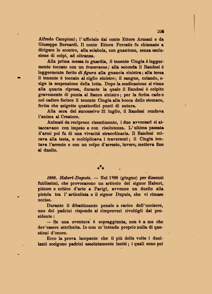 1888. Habert-Dupuis. — Nel 1S88 (giugno) per dissensi futilissimi, che provocarono un articolo del signor Habert, pittore e critico d'arte a Parigi, avvenne un duello alla pistola tra 1* articolista e il signor Dupuis, che vi rimase ucciso.