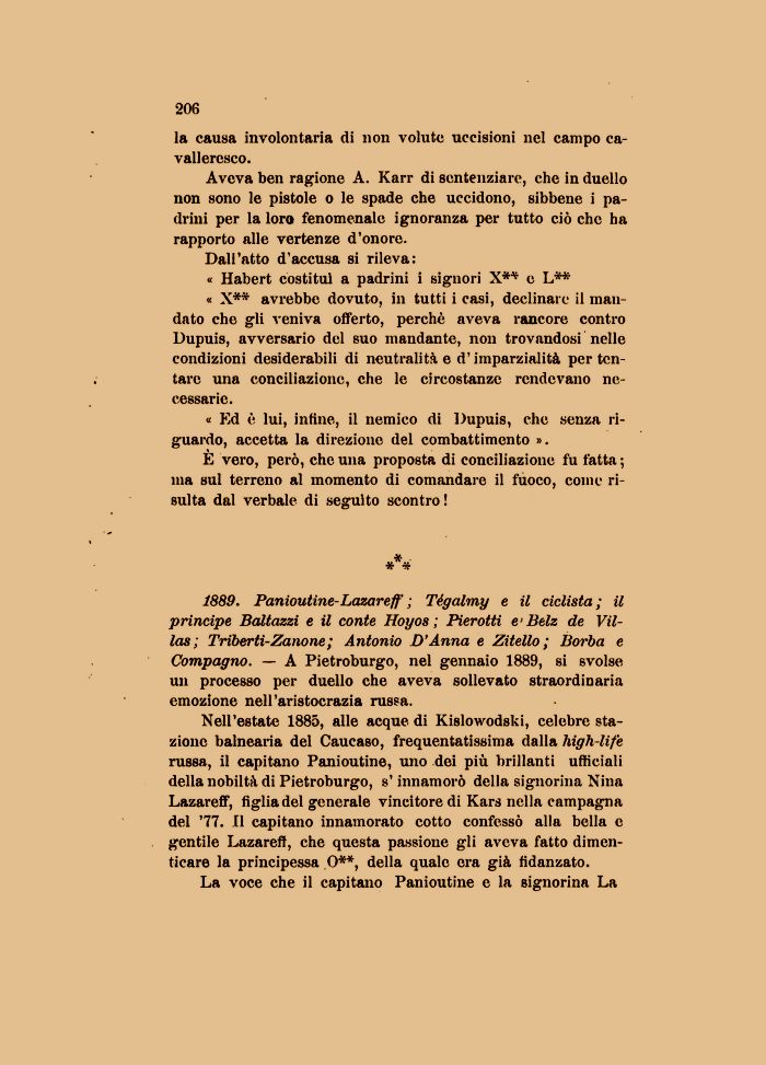 1889. Panioutine-Lazareff' ; Tégalmy e il ciclista ; il principe Baltazzi e il conte Hoyos ; Pierotti e'Belz de Vil-las; Triberti-Zanone; Antonio D'Anna e Zitello; Borba e Compagno. — A Pietroburgo, nel gennaio 1889, si svolse un processo per duello che aveva sollevato straordinaria emozione nell'aristocrazia russa.