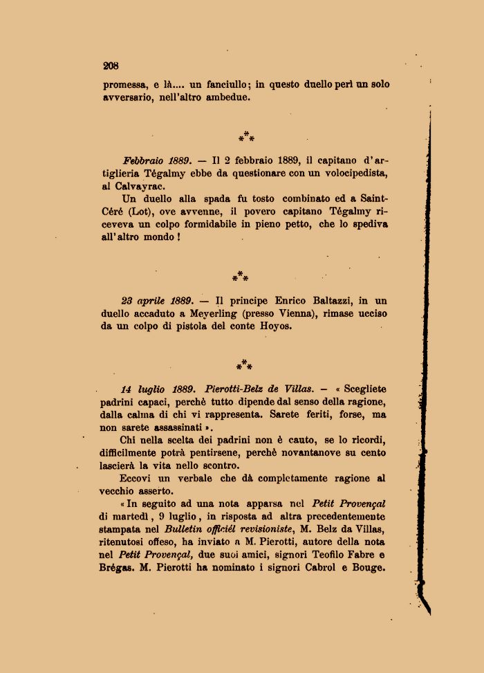 14 luglio 1889. Pierotti-Belz de Villas. — « Scegliete padrini capaci, perchè tutto dipende dal senso della ragione, dalla calma di chi vi rappresenta. Sarete feriti, forse, ma non sarete assassinati ».