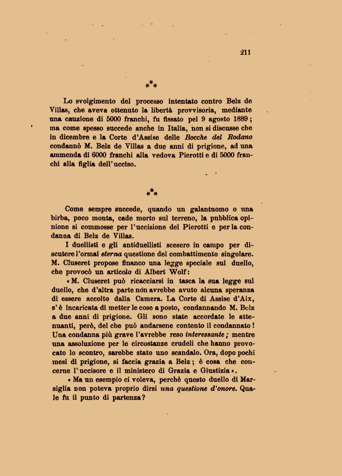 « M. Cluseret può ricacciarsi in tasca la sua legge sul duello, che d'altra parte non avrebbe avuto alcuna speranza di essere accolto dalla Camera. La Corte di Assise d'Aix, s'è incaricata di metter le cose a posto, condannando M. Belz a due anni di prigione. Gli sono state accordate le attenuanti, però, del che può andarsene contento il condannato ! Una condanna più grave l'avrebbe reso interessante ; mentre una assoluzione per le circostanze crudeli che hanno provocato lo scontro, sarebbe stato uno scandalo. Ora, dopo pochi mesi di prigione, si faccia grazia a Belz ; è cosa che concerne l'uccisore e il ministero di Grazia e Giustizia».