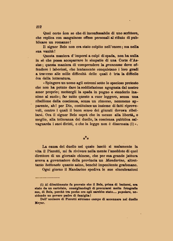 La causa del duello nel quale lasciò si malamente la vita il Pierotti, mi fa rivivere nella mente l'aneddoto di quel direttore di un giornale chinese, che per sua grande jattura aveva a governatore della provincia un Mandarino, altrettanto bottonato quanto asino, benché impenitente grafomane.