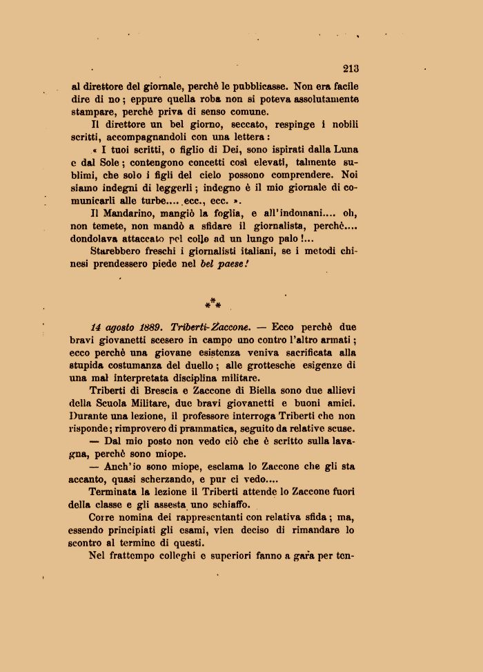 14 agosto 1889. Triberti- Zaccone. — Ecco perchè due bravi giovanetti scesero in campo uno contro l'altro armati ; ecco perchè una giovane esistenza veniva sacrificata alla stupida costumanza del duello ; alle grottesche esigenze di una mal interpretata disciplina militare.