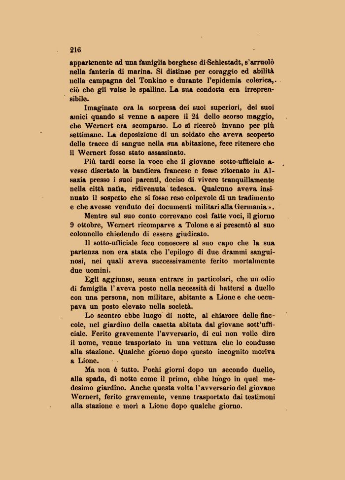 Più tardi corse la voce che il giovane sotto-ufficiale a-vesse disertato la bandiera francese e fosse ritornato in Alsazia presso i suoi parenti, deciso di vivere tranquillamente nella città natia, ridivenuta tedesca. Qualcuno aveva insinuato il sospetto che si fosse reso colpevole di un tradimento e che avesse venduto dei documenti militari alla Germania ».