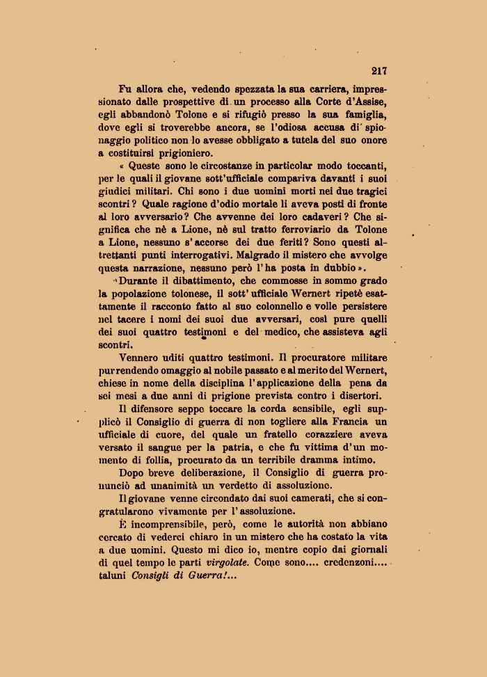'Durante il dibattimento, che commosse in sommo grado la popolazione tolonese, il sott' ufficiale Wernert ripetè esattamente il racconto fatto al suo colonnello e volle persistere nel tacere i nomi dei suoi due avversari, così pure quelli dei suoi quattro testimoni e del medico, che assisteva agli scontri.