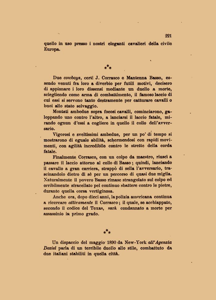 Un dispaccio del maggio 1890 da New-York all'Agenzìa Daziel parla di un terribile duello allo stile, combattuto da due italiani stabiliti in quella città.