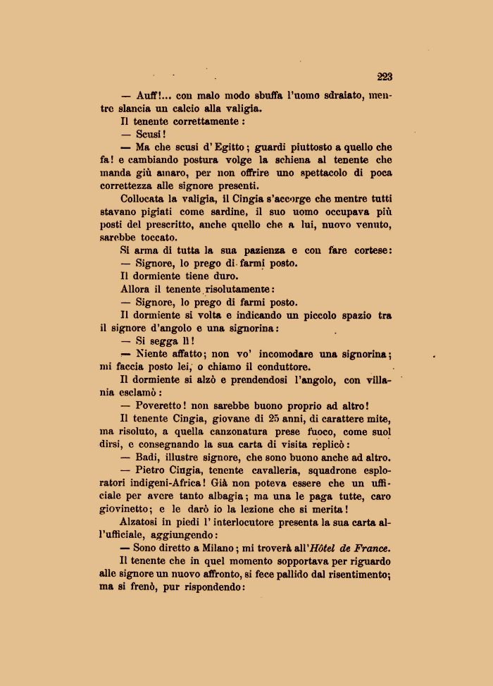 — Pietro Cingia, tenente cavalleria, squadrone esploratori indigeni-Africa! Già non poteva essere che un ufficiale per avere tanto albagia ; ma una le paga tutte, caro giovinetto ; e le darò io la lezione che si merita !