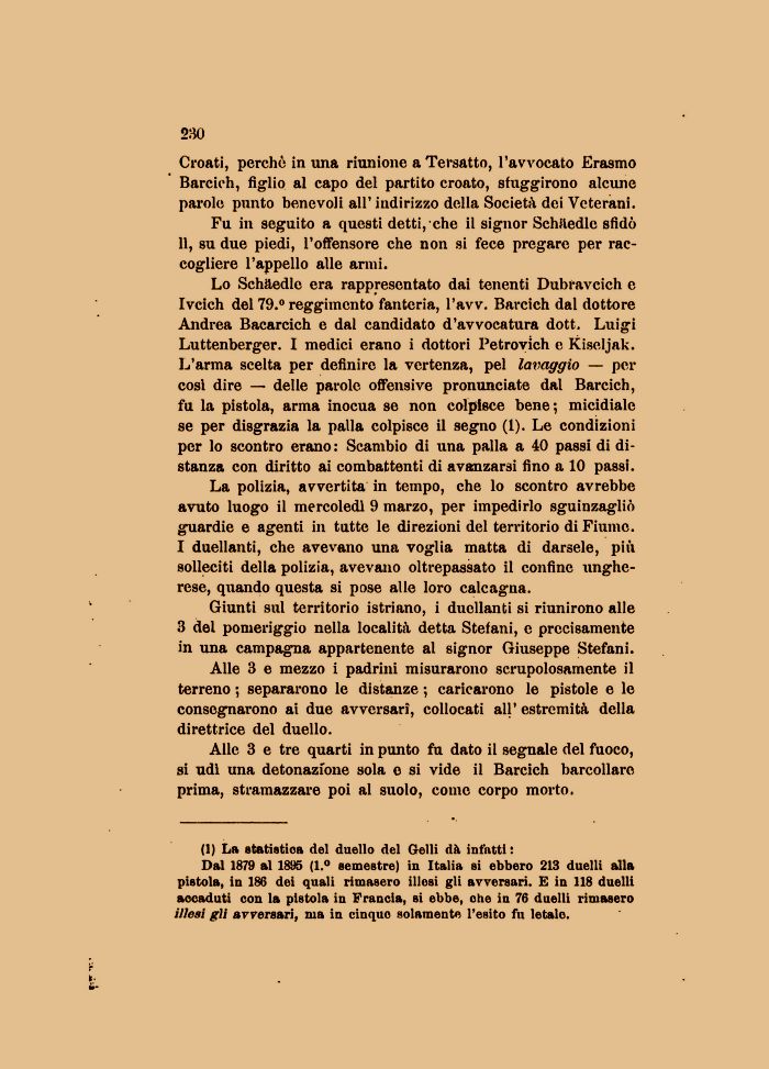 Lo Schaedle era rappresentato dai tenenti Dubravcich e Ivcich del 79.° reggimento fanteria, l'avv. Barcich dal dottore Andrea Bacarcich e dal candidato d'avvocatura dott. Luigi Luttenberger. I medici erano i dottori Petrovich e Kiseljak. L'arma scelta per definire la vertenza, pel lavaggio — per cosi dire — delie parole offensive pronunciate dal Barcich, fu la pistola, arma inocua se non colpisce bene ; micidiale se per disgrazia la palla colpisce il segno (1). Le condizioni per lo scontro erano: Scambio di una palla a 40 passi di distanza con diritto ai combattenti di avanzarsi fino a 10 passi.