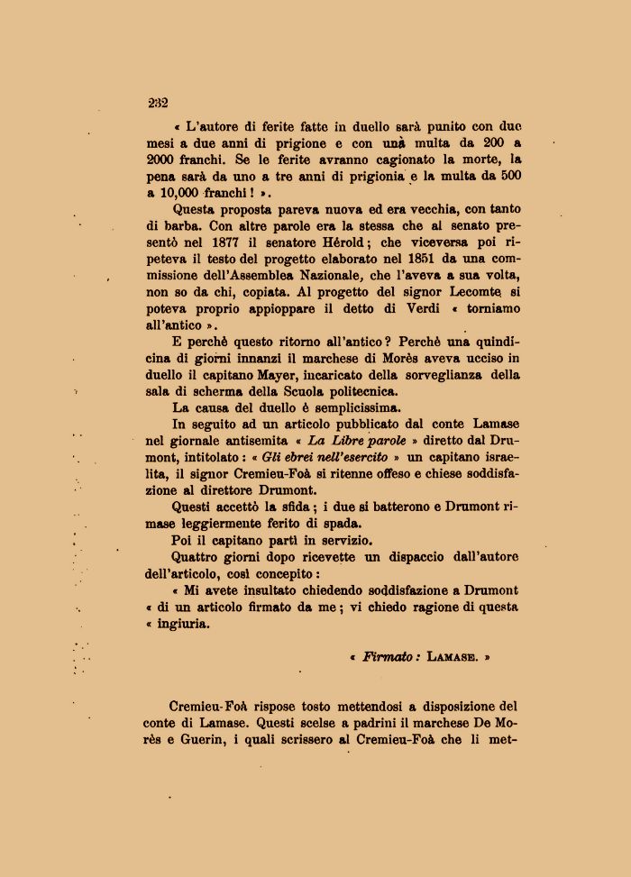 In seguito ad un articolo pubblicato dal conte Lamase nel giornale antisemita « La Libre parole » diretto dal Dru-mont, intitolato : « Gli ebrei nell'esercito » un capitano israelita, il signor Cremieu-Foà si ritenne offeso e chiese soddisfazione al direttore Drumont.