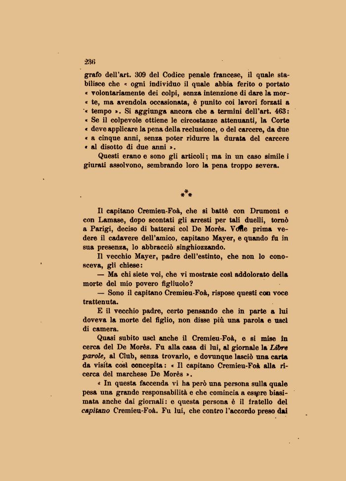 Il capitano Cremieu-Foà, che si battè con Drumont e con Lamase, dopo scontati gli arresti per tali duelli, tornò a Parigi, deciso di battersi col De Morès. V<^e prima vedere il cadavere dell'amico, capitano Mayer, e quando fu in sua presenza, lo abbracciò singhiozzando.