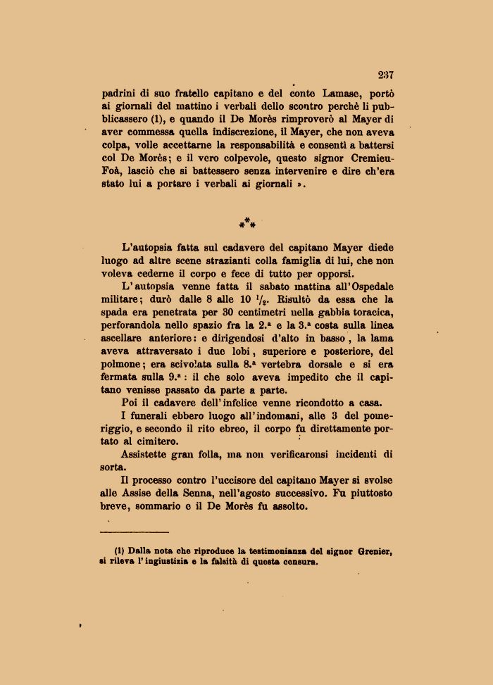 padrini di suo fratello capitano e del conte Lamase, portò ai giornali del mattino i verbali dello scontro perchè li pubblicassero (1), e quando il De Morès rimproverò al Mayer di aver commessa quella indiscrezione, il Mayer, che non aveva colpa, volle accettarne la responsabilità e consenti a battersi col De Morès; e il vero colpevole, questo signor Cremieu-Foà, lasciò che si battessero senza intervenire e dire ch'era stato lui a portare i verbali ai giornali ».