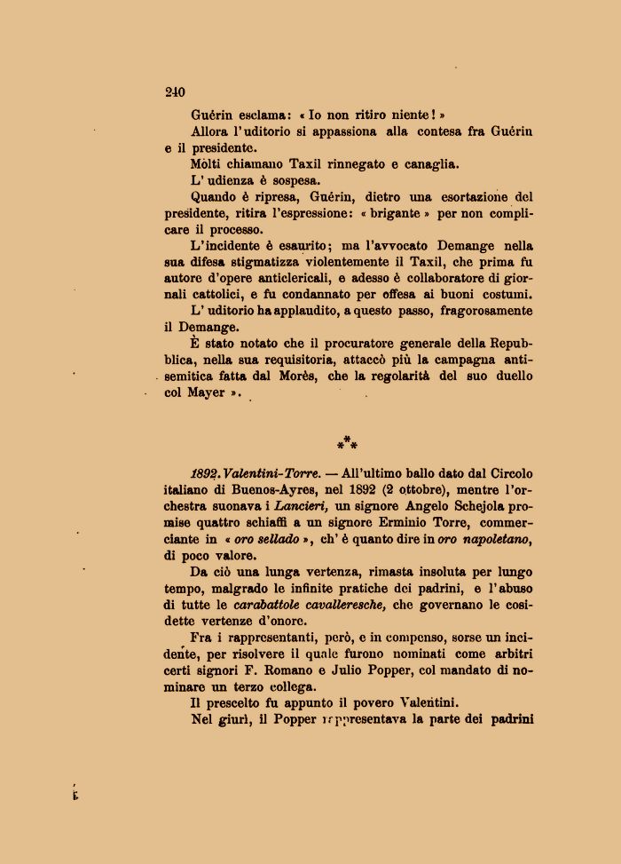 1892.Valentini-Torre. —All'ultimo ballo dato dal Circolo italiano di Buenos-Ayres, nel 1892 (2 ottobre), mentre l'orchestra suonava i Lancieri, un signore Angelo Schejola promise quattro schiaffi a un signore Erminio Torre, commerciante in « oro sellado », eh' è quanto dire in oro napoletano, di poco valore.