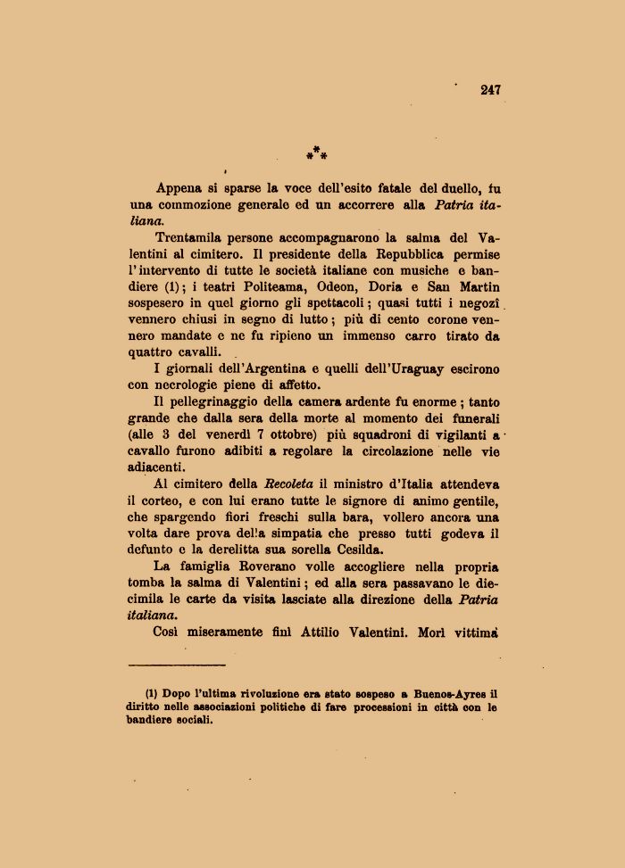 Al cimitero della Recoleta il ministro d'Italia attendeva il corteo, e con lui erano tutte le signore di animo gentile, che spargendo fiori freschi sulla bara, vollero ancora una volta dare prova della simpatia che presso tutti godeva il defunto e la derelitta sua sorella Cesilda.