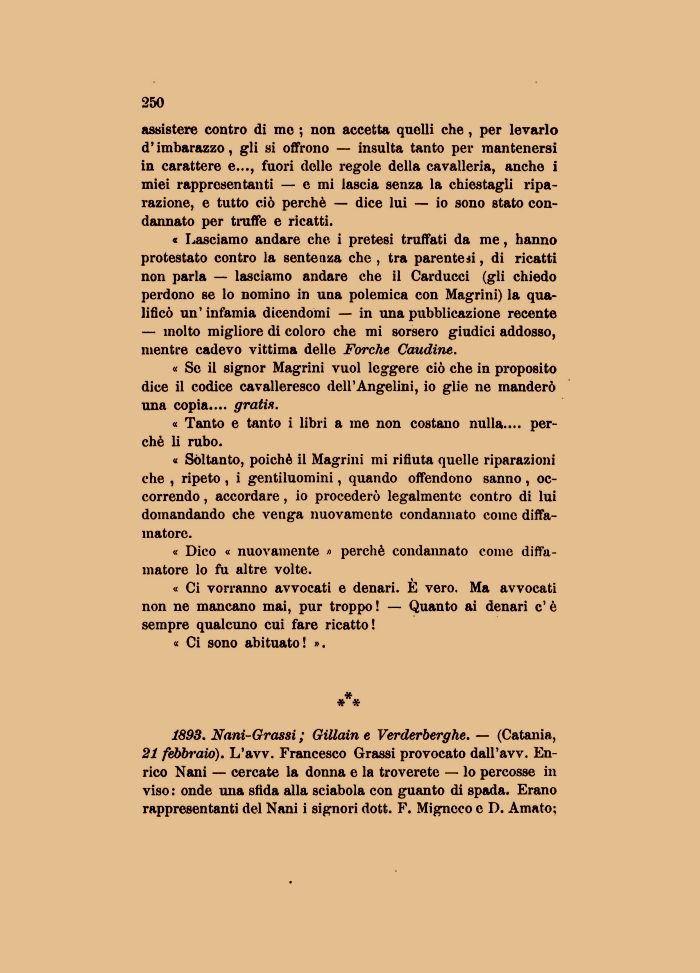 « Lasciamo andare che i pretesi truffati da me , hanno protestato contro la sentenza che , tra parentesi, di ricatti non parla — lasciamo andare che il Carducci (gli chiedo perdono se lo nomino in una polemica con Magrini) la qualificò un' infamia dicendomi — in una pubblicazione recente — molto migliore di coloro che mi sorsero giudici addosso, mentre cadevo vittima delle Forche Caudine.