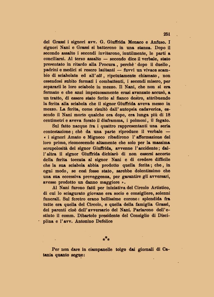 del Grassi i signori avv. G. Giuffrida Monaco e Anfuso. I signori Nani e Grassi si batterono in una stanza. Dopo il secondo assalto i secondi invitarono, inutilmente, le parti a conciliarsi. Al terzo assalto — secondo dice il verbale, stato presentato in ritardo alla Procura , perchè ' dopo ii duello , padrini e medici si resero latitanti — fuvvi un vivace scambio di sciabolate ed all'alt, ripetutamente chiamato, non essendosi subito fermati i combattenti, i secondi misero, per separarli le loro sciabole in mezzo. Il Nani, che non si era fermato e che anzi impetuosamente erasi avanzato accusò, a un tratto, di essere stato ferito al fianco destro, attribuendo la ferita alla sciabola che il signor Giuffrida aveva messo in mezzo. La ferita, come risultò dall' autopsia cadaverica, essendo il Nani morto qualche ora dopo, era lunga più di 18 centimetri e aveva forato il diaframma, i polmoni, il fegato.